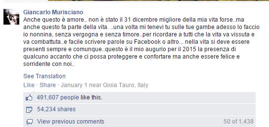 Ο νεαρός Ιταλός γράφει στη λεζάντα της φωτογραφίας: “Αυτό είναι η αγάπη. Μπορεί να μην ήταν η καλύτερη 31η Δεκεμβρίου της ζωής μου, αλλά αυτό είναι μέρος της καθημερινότητάς μου. Κάποια εποχή με κρατούσες εσύ στα γόνατα και τώρα είναι η σειρά μου, μικρή μου γιαγιά, χωρίς ντροπή ή φόβο και θα ήθελα να υπενθυμίσω ότι τη ζωή πρέπει να τη ζούμε και να δίνουμε μάχη γι’ αυτήν.”