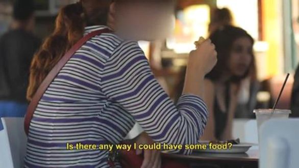 Στο βίντεο που ακολουθεί, ένας νεαρός από την ομάδα Spread the message ρωτάει τους θαμώνες σε ένα εστιατόριο αν υπάρχει κάποιος τρόπος να του δώσουν λίγο φαγητό γιατί πεινάει. Όλες οι απαντήσεις ήταν αρνητικές.