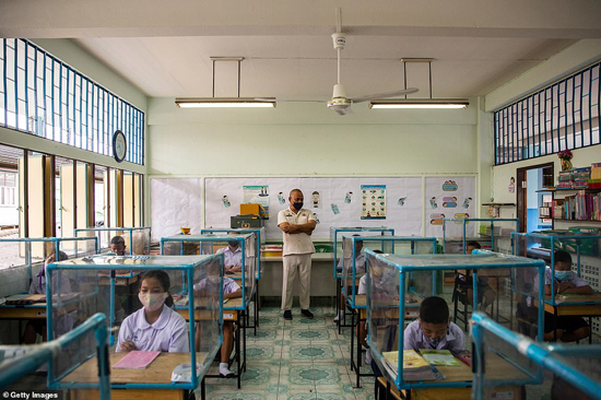 Νηπιαγωγεία και σχολεία θυμίζουν εικόνες βγαλμένες από ταινία φαντασίας. Με μεγάλες αποστάσεις μεταξύ των παιδιών, φορώντας μάσκες και κάνοντας μάθημα μέσα σε πλαστικά κουτιά! Οι εικόνες που θα δείτε προέρχονται από το σχολείο Wat Khlong Toey στην Μπανγκόκ σύμφωνα με τη dailymail.